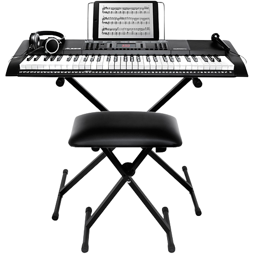 The Alesis Harmony 61 MKII also comes with an easy-to-assemble stand, a bench with three adjustable height settings, headphones that automatically mute the speakers for private practice, a music rest for holding sheet music, a power adapter and a microphone. Features 61 piano-style keys with built-in speakers 300 built-in tones with layer and split modes One touch song mode with 300 built-in rhythms Play along with 40 demo songs or record your own 1/8" headphone jack mutes speakers for private practice