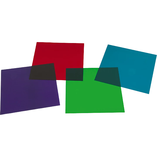 These light gels fit PAR 46 cans. 7" x 7". Includes magenta, Congo blue, light green and aqua.
