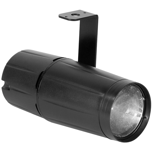 Tightly focused LED pinspot with powerful beam. This is ideal for highlighting smaller areas on a stage and most especially for aiming into a mirror ball. Features Bright and powerful Long life Includes hanging bracket Two lenses included
