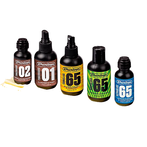 Description The Dunlop System 65 Guitar Maintenance Kit contains 1 each of every Dunlop guitar care product: Formula 65 Polish, Bodygloss 65 Cream of Carnauba Wax, Ultraglide 65 String Saver, Fingerboard 01 Cleaner/Prep, Fingerboard 02 Conditioner, and 2 cotton polish cloths. NOTE: Fingerboard 01 Cleaner/Prep and Fingerboard 02 Conditioner are not for use with maple fingerboards.
