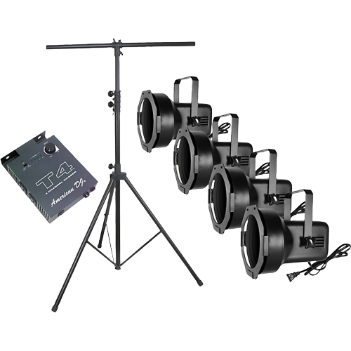 Hanging bracket allows easy mounting on light stands. Features 4 professional PAR-38 cans: Medium screw base sockets UL listed Includes lamps, hanging brackets, and 3-prong power cords May be used with any medium screw-base (E27 socket) 110V lamp 20V/60Hz operation Gels sold separately Lighting Stand: Holds 4 lights Adjusts from 60"-144" high T4 4-channel Chase Controller: 1 – 10 minute timed chase Instant sound-to-light chase 4-channel chase controller 4 Standard Edison 3-prong plugs (one per channel) Timed, Audio, or Chase modes Audio mode: chase patterns are executed by the sound of music Chase mode: chase patterns are controlled by the speed knob Speed knob controls chases from slow to fast Built-in microphone Power switch LED channel indicators Hanging bracket makes the T4 easy to hang on a light stand Maximum output 500W per channel Dimensions: 8"W x 2"H x 5-1/2"D 120V or 220V operation