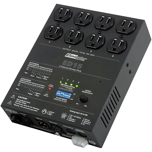 This unique 4-channel DMX dimmer pack lets you take control of your light show like never before. With 16 automatic and sound-activated, built-in programs, the Eliminator ED-15 is designed to precisely control your light fixtures' movement.