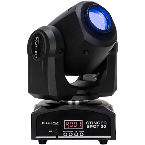 The Eliminator Lighting Stinger Spot 30 is a mini moving head with a crisp 30-watt LED source and advanced optics. Its compact size makes it ideal for mobile entertainers, small club and bars, roller rinks, bowling centers or any mobile production.
