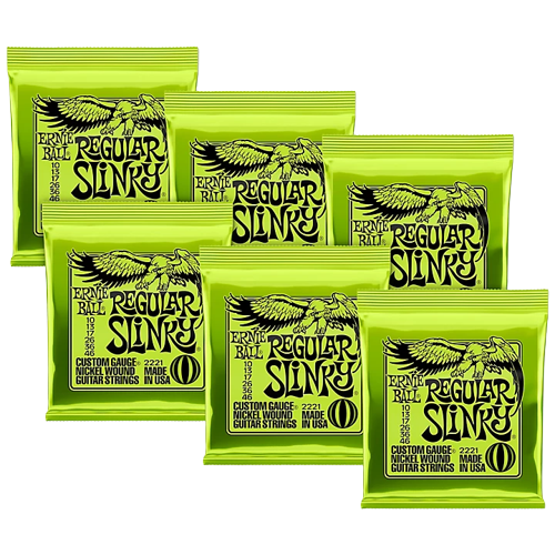 Description Gauges 10-13-17-26-36-46. Ernie Ball 2221 Regular Slinky Electric Guitar Strings feature nickel-plated steel wire wrapped around tin-plated, hex-shaped, steel core wire. Slinky strings provide vibrant, bright, lasting tone and reduce fret wear.