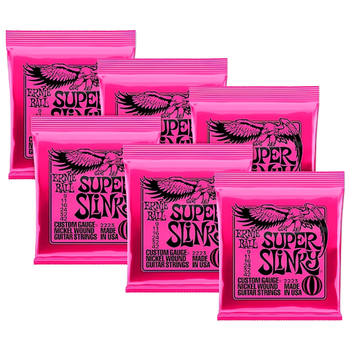 Description Gauges 9-11-16-24w-32-42. Nickels are the most popular of the Ernie Ball Slinky guitar strings. They're made from nickel-plated steel wire wrapped around tin-plated hex-shaped steel core wire. The replacement strings produce a well-balanced all-around good sound.