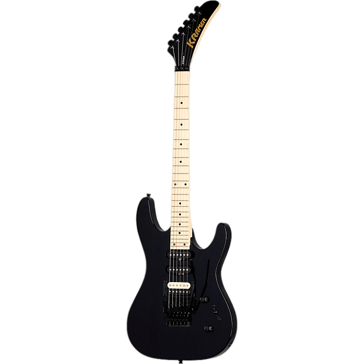 Additional appointments include die-cast tuners, a Floyd Rose R2 locking nut, and black hardware. Features Double-cutaway mahogany body Maple neck in a Kramer K-Speed SlimTaper C-shaped profile Maple fingerboard with 24 frets and black dot inlays Kramer Alnico 5 HB-1 zebra-coil humbucker at the bridge, and dual Alnico 5 SC-1 single-coil pickups at the middle and neck