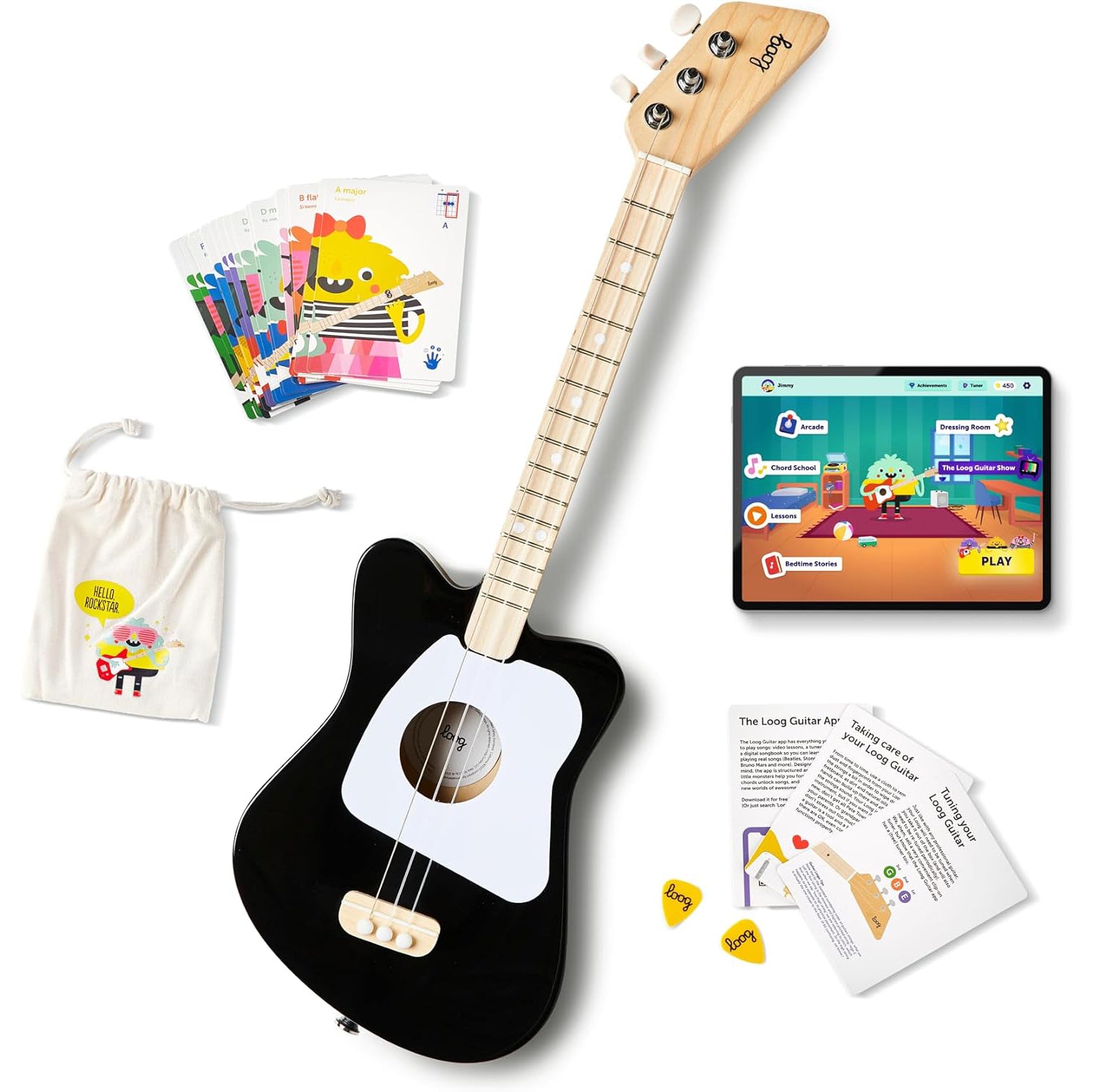 About this item The ideal first guitar for children ages 3+. Award-winning 3-string design allows for an easier and faster learning process. With the Loog Mini, kids feel rewarded and encouraged to keep on playing and learning. Approved by educators: Learn on a Loog, play any guitar. Real wood, real guitar: specially designed for small hands, with low string action, perfect intonation and nylon strings for a beautiful classical guitar sound. Includes chord flashcards, free video lessons, and full access to the Loog Guitar app (iOS and Android), so they can learn on their own, at their own pace.