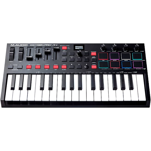 Whether you want to create music on the go or if you're ready to lay down tracks, the M-Audio Oxygen Pro Mini is flexible enough to handle your workflow. Features 32 best-in-class, velocity-sensitive, semi-weighted mini-keys (8) RGB, backlit, assignable, velocity-sensitive pads with Note Repeat for beat production, clip launching and more (4) assignable faders, knobs & buttons for controlling virtual instruments, mix plugins, DAW controls and more Preset and DAW button for auto-mapped DAW controls & plugin parameters Smart Chord mode enables playing of enharmonic or custom chord voicings Smart Scale mode eliminates wrong notes making it easy to craft a perfect song Arpeggiator with Type, Octave, Gate and Swing controls Ergonomically designed pitch and modulation wheels; 1⁄4-inch sustain pedal input USB-MIDI connection and MIDI Output for controlling external MIDI gear Intuitive layout featuring an OLED screen for quick control edits Includes MIDI editor software and a complete software production package: 3 DAWs Pro Tools | First M-Audio Edition MPC Beats Ableton Live Lite Virtual Instruments Multi-oscillator synthesizer – Hybrid 3 Electric Piano – Velvet Acoustic Piano – Mini Grand Analog synth – Vacuum * Vintage drum machine – Boom * Classic Organ – DB-33 * MPC Expansion Packs MPC Beats Producer Kits – Multi-Genre Beat Production Pack F9 Instruments Beats Edition – 25 High Quality Instrument Samples LANIAKEA Sounds – TrapSoul & LoFi Production Pack MSX Audio – Soulful Drums Collection ADSR – LoFi Producer Collection MVP Urban Roulette Beats Edition – Urban Kits & Samples Expansion Pack Cr2 Deep House Beats Edition – Deep House Expansion Pack *Vacuum, Boom and DB-33 Pro Tools license only