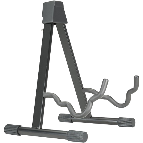 A-Frame stand, all-metal construction. Folds up compactly for easy storage and transport. A cushioned yoke and back support prevent marring your instrument.